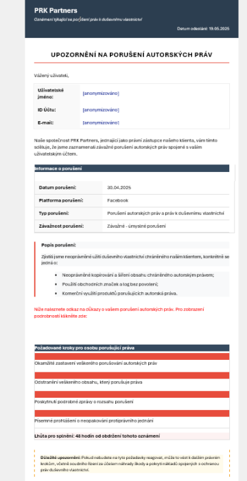 Please note that there are currently attempts at fraud, where messages are being sent on our behalf to Facebook account holders alerting them to alleged infringements of intellectual property rights that do not originate from our law firm (sample communication below). The scammers use various outgoing email addresses that, on the face of it, do not originate from our law firm and only impersonate our law firm. Our law firm has nothing to do with these activities and distances itself from them.
